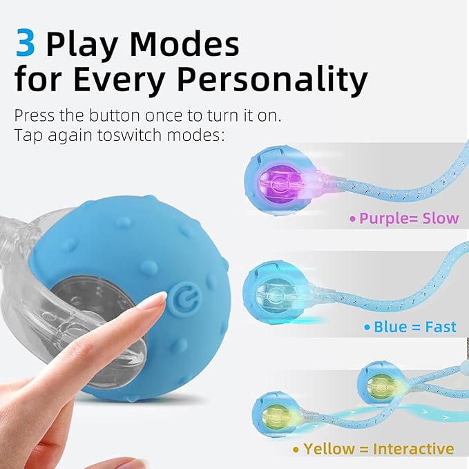 - 3 Modes with Motion-Activated Standby + Mute Option – Choose Fast (blue), Slow (purple), or Interactive (yellow) to match your cat’s personality—whether bold, shy, or full of energy. After 5 minutes of play, the toy sleeps; a firm tap within 30 minutes reactivates it, otherwise it powers off to save energy. Bird chirps stimulate curiosity but can be muted anytime for quiet play.