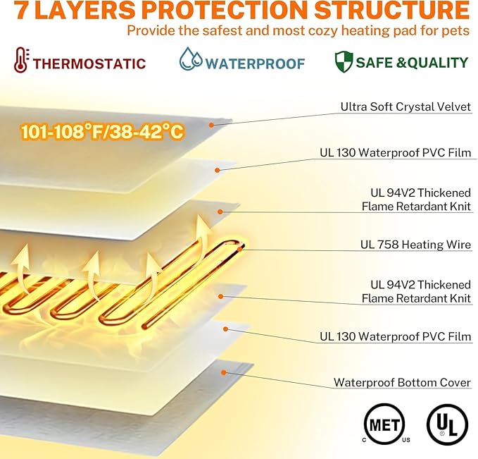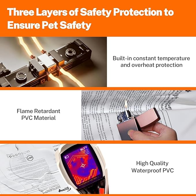 - ❤【SAFETY AND SECURE STRUCTURE】Multi-layer protection structure with UL-certified heating wire protects pets from burns. Soft PVC envelope with waterproof and flame retardant function. Built-in intelligent temperature sensor in the pet heating pad to prevent overheating and spontaneous combustion and protect your pet, which is very safe for you and your pet.