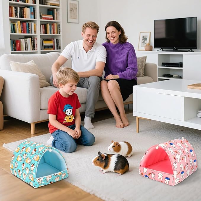 - Friendly Design: Adopting blue and pink, the hamster nest is not easy to get dirty,very practical to use, with bright and beautiful patterns. The integrated design avoids accessories from slipping out and can also avoid the claws of small animals from being caught. The thickened inner cushion makes the Guinea pig bed stand upright and not easily deformed