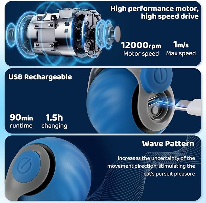 - 🌿【3 speedy Replaceable Tails+DIY Customization】Interactive cat toy ball with replaceable tails adapts to chase instincts.Moving cat toys for indoor cats solve boredom via bouncy ball cat toys design.Attach homemade tails (ribbons/feathers) to the hook.This cat rolling ball toy runs safely.Let your DIY spirit shine.This active cat toys for indoor enables instant 180° reversals,mimicking elusive prey, wave design,when the toy meets an obstacle,it will automaticall correct itself