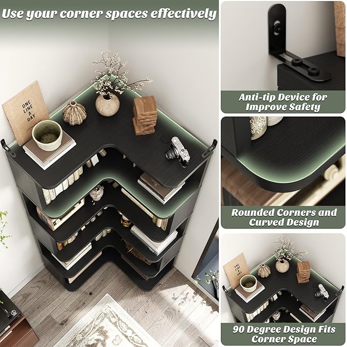 - Space-Saving Corner Design - This corner bookshelf is expertly designed to utilize underused corner spaces in any room, transforming dead zones into functional storage. Its 90° angled back seamlessly fits against walls, while the tiered shelves expand outward to provide ample display/storage area without obstructing walkways, maximizing unused space while offering great stylish storage