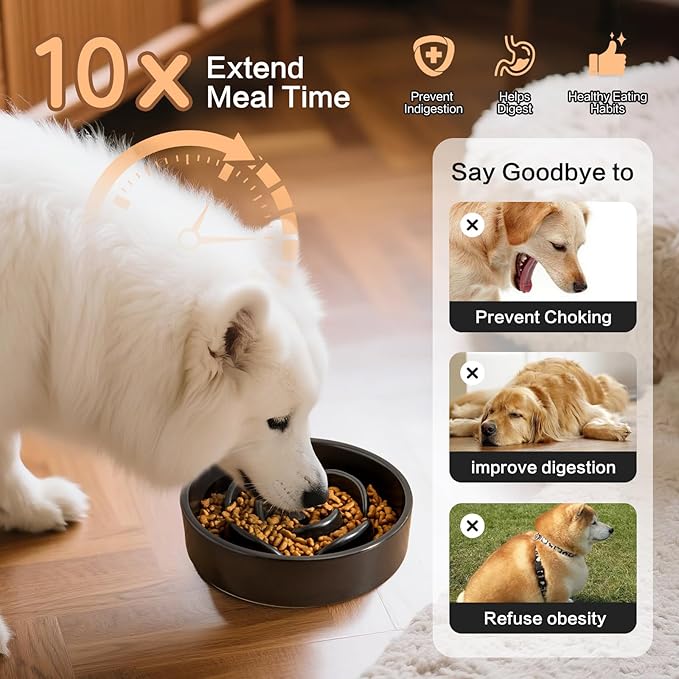 - Heavyweight & Non-Slip Base: This ceramic slow feeder dog bowl measures 6"W * 1.77"H" and can hold up to 11oz ≈ 340ml and weighs up to 0.7kg (about 1.54 lbs), suitable for different breeds of cats and small dogs. Stays firmly in place, preventing spills and messes, even with enthusiastic eaters.
