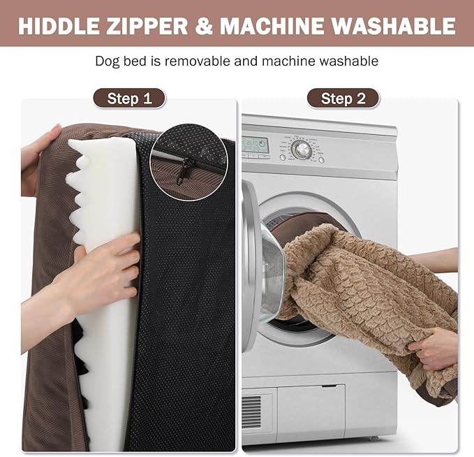 - ๐ถWATERPROOF & WASHABLE DOG BED: The dog bed features a removable, machine-washable cover with a zipper for easy to quick remove and care, so just throw it in the washing machine and will be as good as new, ensuring your pet's space stays fresh and hygienic. The waterproof inner lining fully protect the foam from spills, water damage, or accidents, prolonging the product's life.