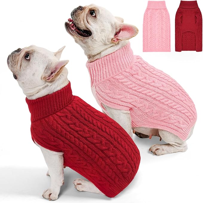 2 Pack Dog Sweaters for Medium Dogs Turtleneck Pullover Cable Knit Stretch Clothes French Bulldog Dachshund Boston Terrier Corgi Beagle Pug Boy Girl Pets Winter Clothes (M, Pink & Red)