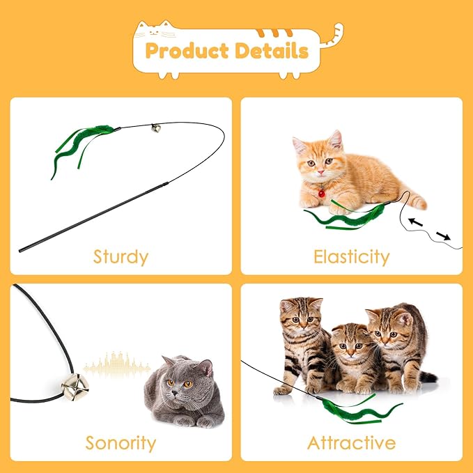 - More Joy: Cats enjoy chasing objects, especially when playing with their owners. We offer each cat family member one cat stick, two elastic balls with long tails, and one elastic ball with feathers. These four items satisfy all the pleasures of cats at once!