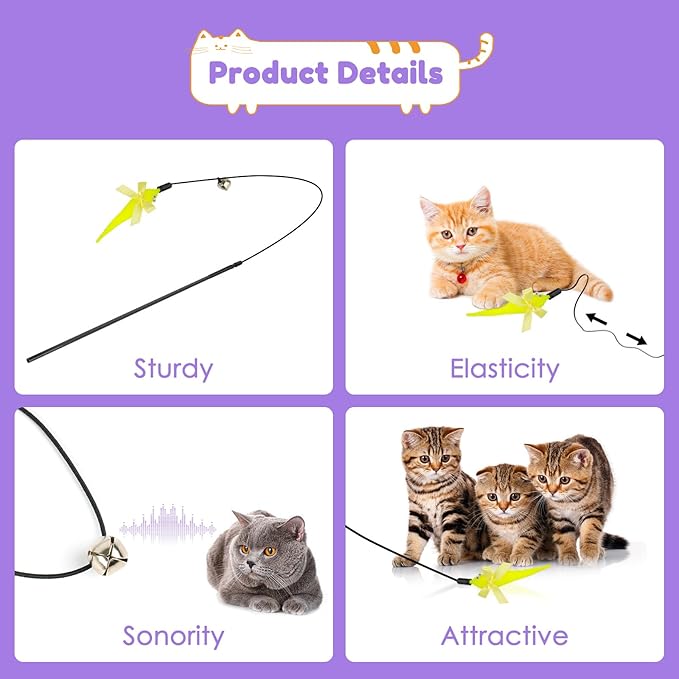 - More Joy: Cats enjoy chasing objects, especially when playing with their owners. We offer each cat family member one cat stick, two elastic balls with long tails, and one elastic ball with feathers. These four items satisfy all the pleasures of cats at once!