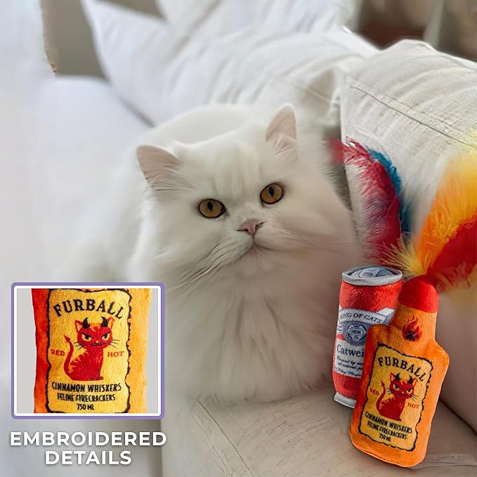 - Funny Parody Cat Plush Toys: Crack open some feline fun with the Catweiser and Furball cat toys! Featuring one red plush can and one bright orange-yellow bottle, each topped with vibrant feather tails, this playful catnip toy collection keeps kitties entertained