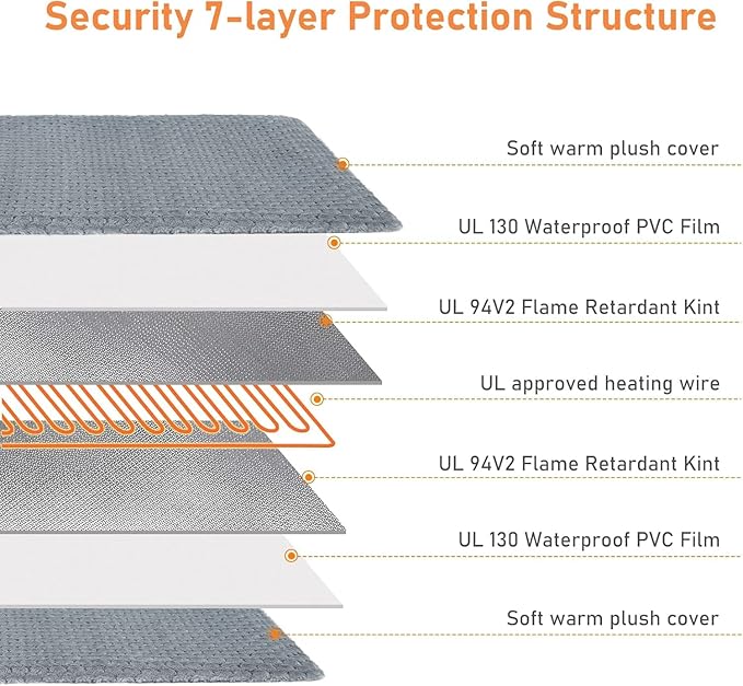 - ๐ถUnique Safety Design: In order to prevent dogs from biting the wire and getting electrocuted, the wire is wrapped by spiral chewy cover. 7-layer protective structure with UL-certified heating wire protect pets from burns. Soft PVC envelope with waterproof and flame-retardant function. Built-in intelligent temperature sensor in the heating pad to prevent overheating to protect pets. Donโt let your pets lay on the pet heating pad without a plush cover.