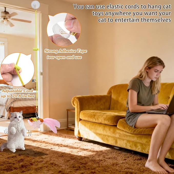 - Keeping Appealing to Cats: The interactive cat toy set includes hanging cat toy that easily extends from 10 inches to 70.8 inches. One end of the rope attaches to replacement with a quick-release buckle design. The other end features a strong adhesive tape, allowing you to hang the cat toy under doors, on cat trees, or anywhere you want your cat self paly. Multiple play options keep your cat engaged for longer periods