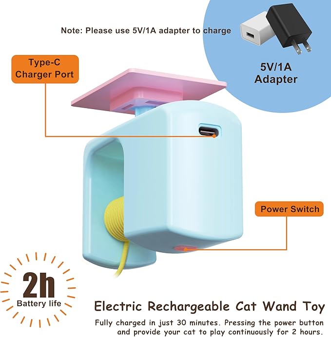 - Persistent self play to keep cats busy and active: The electronic kitten toy can be charged normally with the USB cable and a DC 5V/1A adapter. For the first time, please charge it fully. After full charge, it can provide 4 hours of long-lasting play time, so your cats can play for a long time and release their vigorous energy