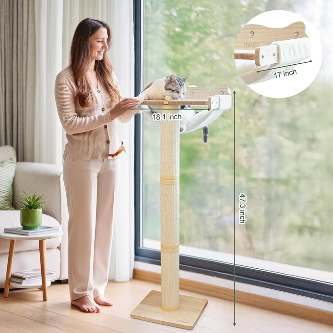 - Reinforced Stability & Customizable Height: The base has been significantly expanded from 11.8" x 9.1" to 13.4" x 11.8" and thickened by 0.2 inches for superior stability and tip resistance. Adjustable posts allow tailored height configurations to match your space, while high-quality materials including solid sisal, natural linen, and polished wood ensure lasting enjoyment for both cats and owners.