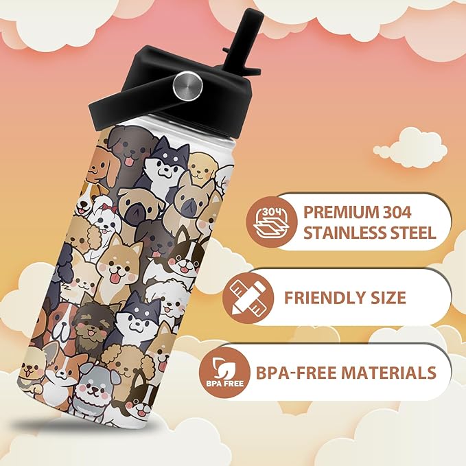 - Vacuum Insulation: The puppy insulated water bottle has double-wall vacuum insulation design, keeping both hot and cold beverages at the desired temperature for extended periods. Enjoy your drink at your favorite temperature anytime, anywhere. It also prevents condensation from forming, keeping the water bottle dry