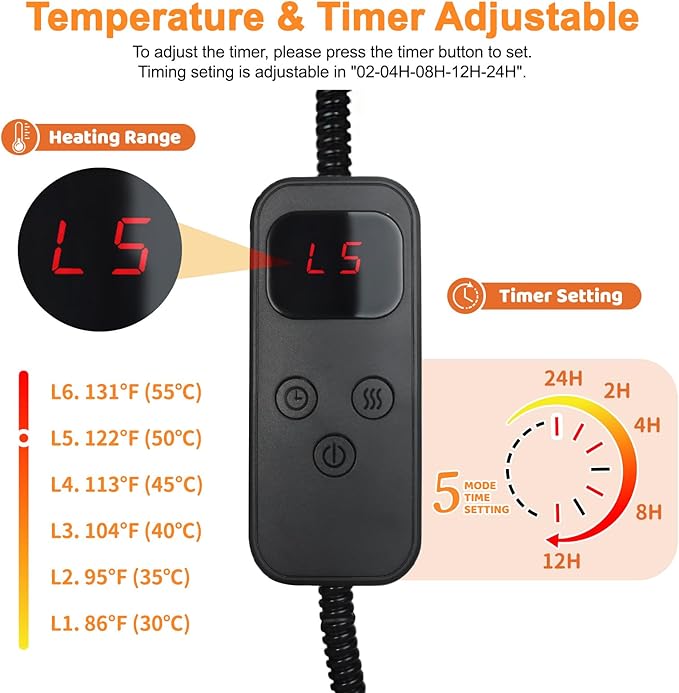 - 【Fast Heating with Auto Shut-Off Timer】The pet heating mat warms up quickly and features 5 timer settings (2H/4H/8H/12H/24H) for energy-saving convenience. Automatically shuts off to prevent overheating, ensuring safety while giving your furry friends cozy warmth day and night.