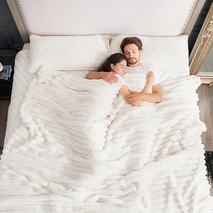 Cozy Bliss Faux Fur Throw Blanket for Couch, Cozy Warm Plush Striped Blanket for Sofa Bedroom Living Room, 108 * 90 Inches Cream White