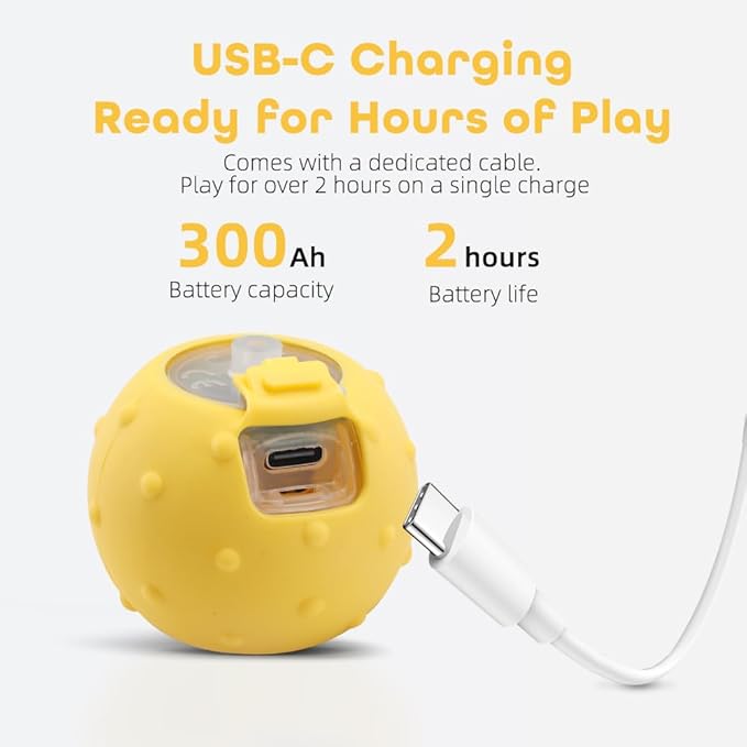 - USB-C Rechargeable, Durable Build & Easy Maintenance – Powered by a USB-C cable (included, 5V/1A adapter recommended) for reliable, repeatable charging. One charge supports multiple play sessions, eliminating disposable batteries. Built tough to withstand zoomies, bumps, and even dog sneak attacks. Simply clear trapped hair after play to maintain peak performance.