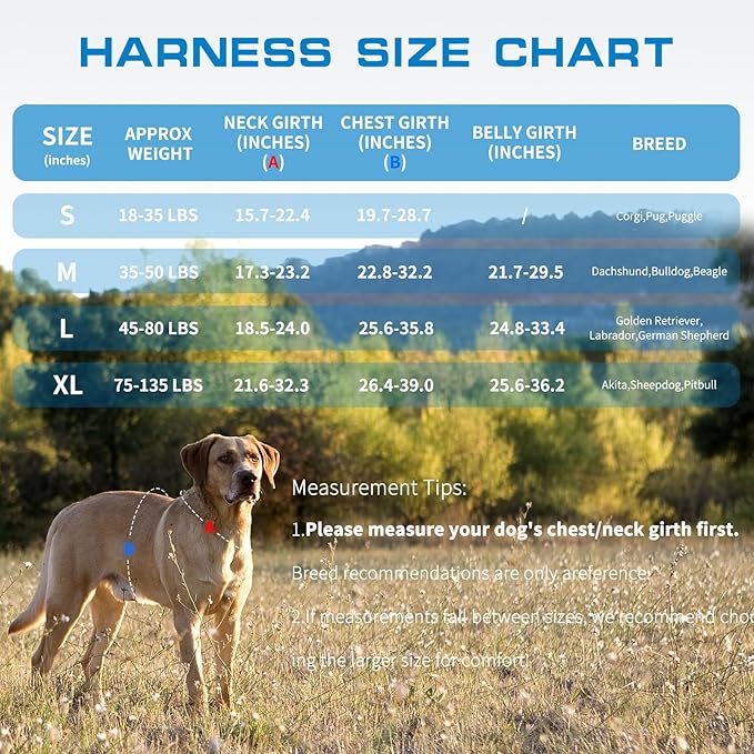 - This dog harness is available in four sizes - Small, Medium, Large, and Extra Large - to suit your dog's needs. Before purchasing, please take accurate measurements of your dog's neck, chest, and belly girth, and select the appropriate size according to our size chart for a perfect fit
