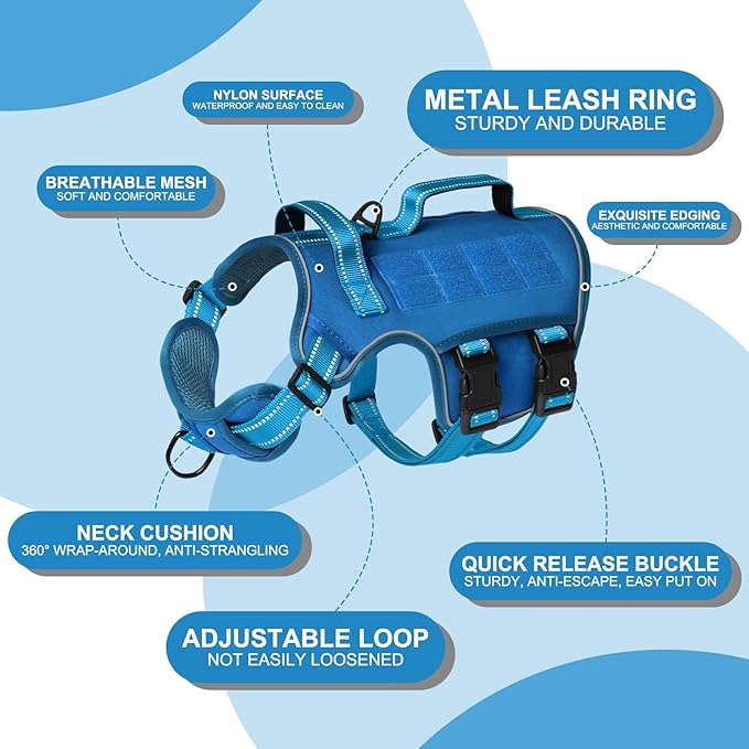 - Easy Control: The front metal leash ring is designed for no-pull control, making it perfect for training or dogs that frequently pull, while the rear ring is ideal for leisurely walks, jogging, or hiking. The dog harness features horizontal and vertical nylon handles for easy grip on your dog.