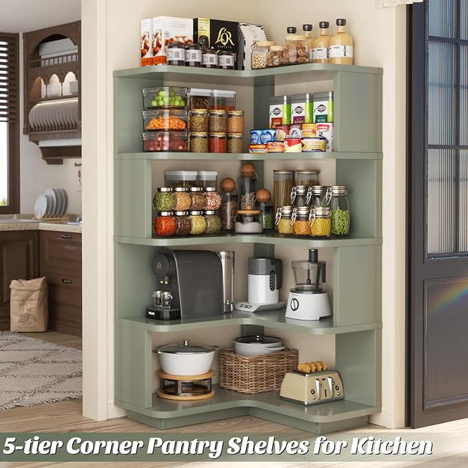 Armocity Corner Book Shelf - 5 Tier Corner Bookshelf Etagere Bookcase with Baffle, Freestanding L Shaped Display Shelf Stand for Home Office, Living Room, Bedroom, Kitchen, Crab Green