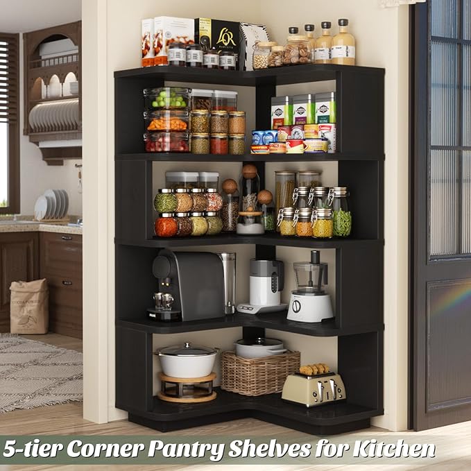 - Multi-Room Versatility – This corner book shelf stand transcends traditional storage, serving as a modular hub for every space in your home. This wood corner shelf can elegantly display art, trailing plants, or books in your living room and office; it can organize sweaters (in fabric bins) and perfumes in the bedroom; it can hold cookbooks or spice jars as corner pantry shelves in the kitchen