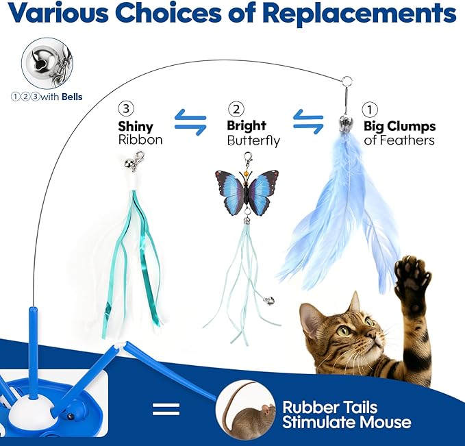 - 【7-in-1 Versatility Play Your Way】Every attachment is fully detachable—because why limit the fun? Tired of waving a wand? Flip to electric mode, sit back, and let the cat wand toy do the work while your cat pounces and swats to their heart’s content. Want to bond? Grab the cat wand and turn playtime into quality time. The choice is yours.