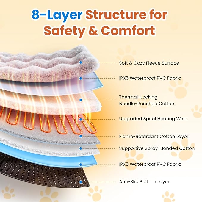 - 【Safe & Reliable Heating Pad】Your pet’s safety comes first. This dog heating pad features an 8-layer protective structure with flame-retardant cotton, waterproof PVC, and an internal thermostat with overheat protection. A chew-resistant steel cord adds security, creating a warm, safe place for worry-free rest—perfect for senior cats and dogs, nursing moms, and newborn puppies.